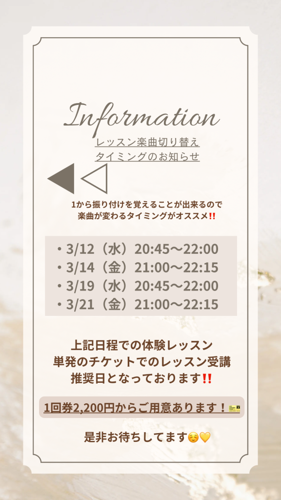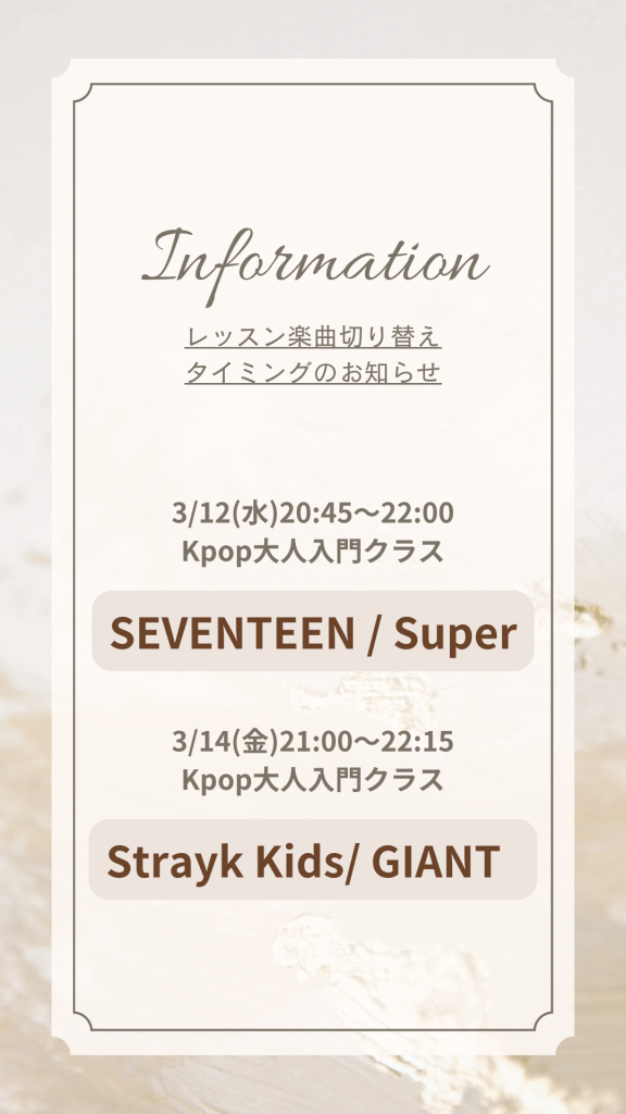 3月に入り、水曜/金曜の大人kpop入門クラスのレッスン楽曲が変わります‼️