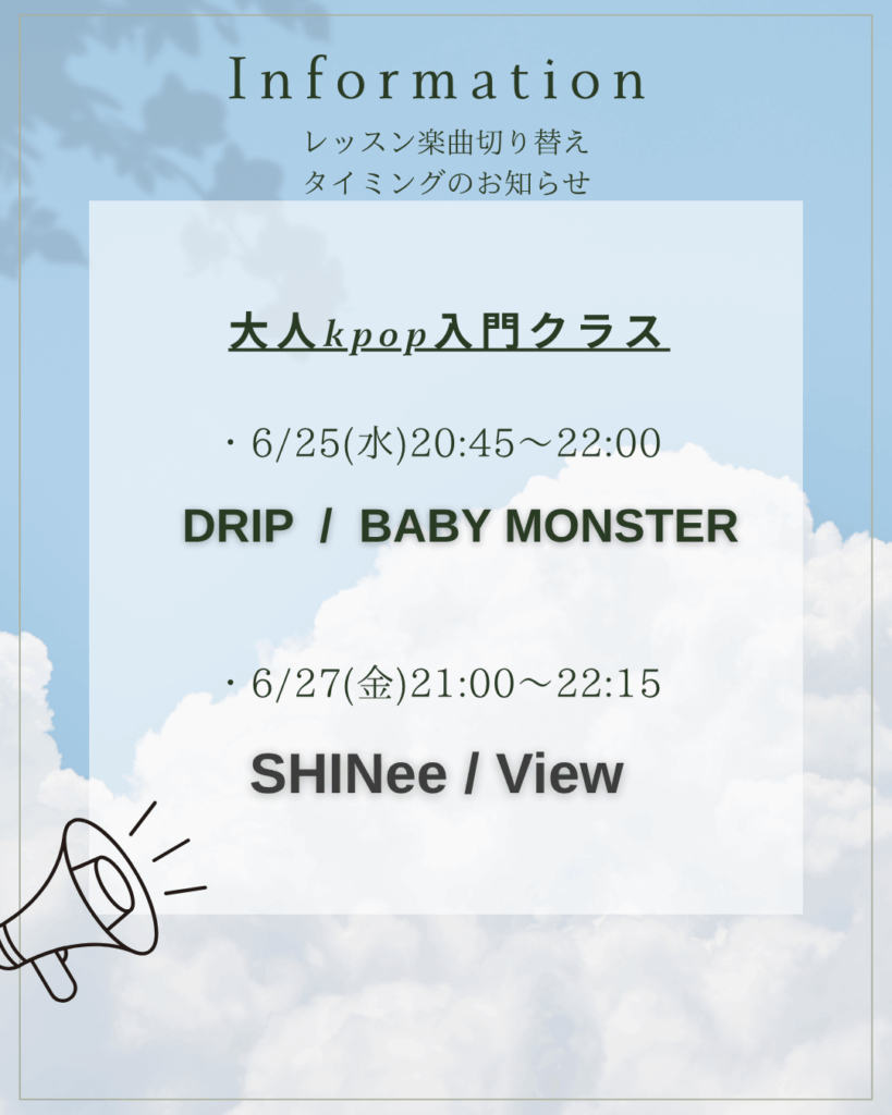 水曜日 / 金曜日の大人kpop入門クラスのレッスン楽曲切り替えタイミングのお知らせです!