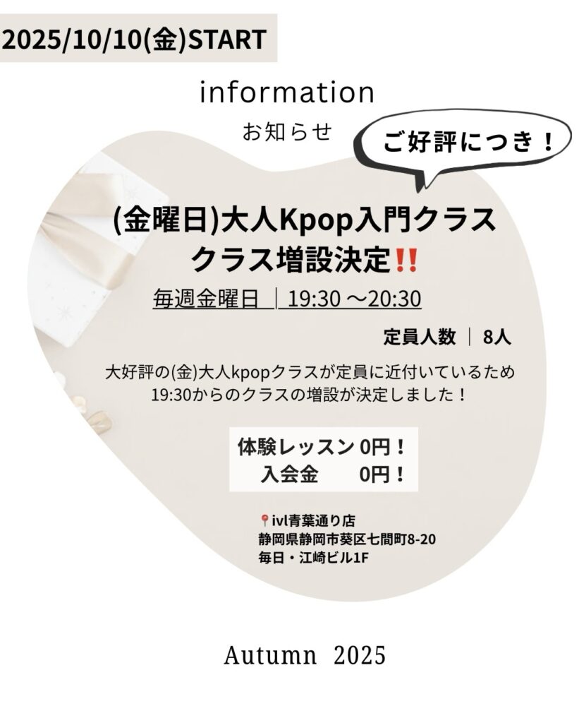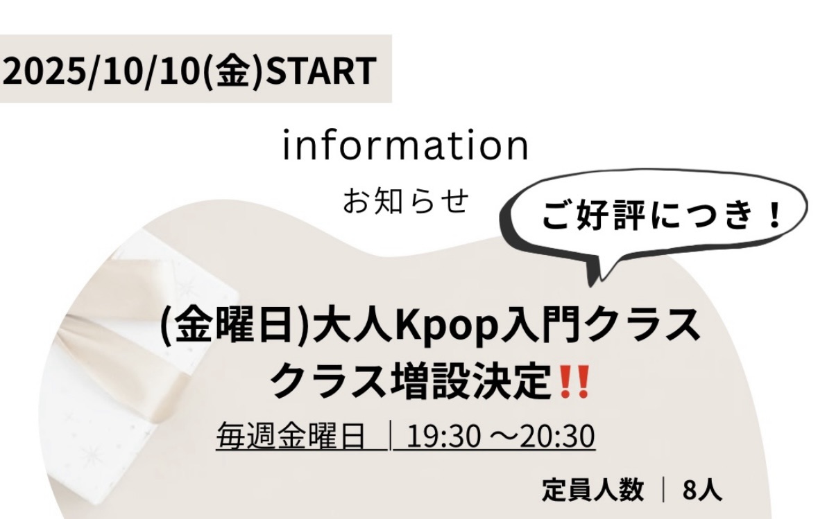 現在大人気の金曜21:00〜大人Kpop入門クラス が、定員に近付いているため、新しく金曜19:30〜20:30 のクラスを増設することになりました!